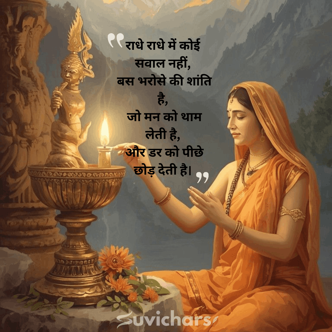 Radhe Radhe Suvichar हमें प्रेम, शांति और पूरी निष्ठा की राह पर चलना सिखाते हैं। इन विचारों को दिल से अपनाने पर मन को शांति और जीवन को मधुरता मिलती है। ऐसे ही भक्तिमय और अच्छी सुविचारों के लिए suvichar से जुड़े रहें और हर दिन को राधा भक्ति की भावना से सजाएँ।
