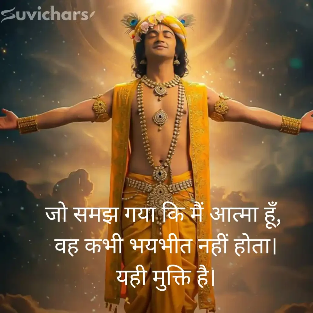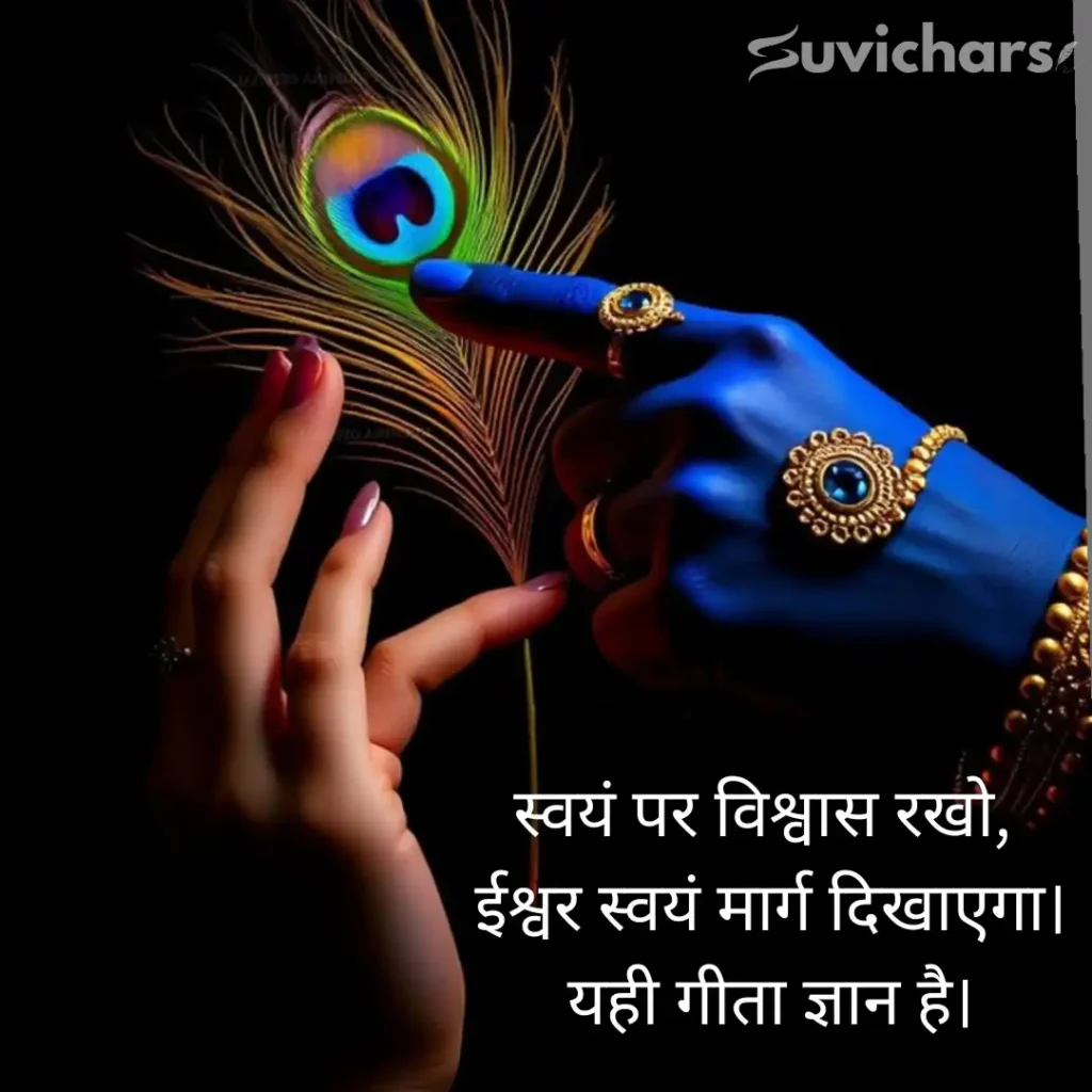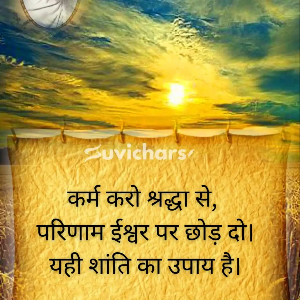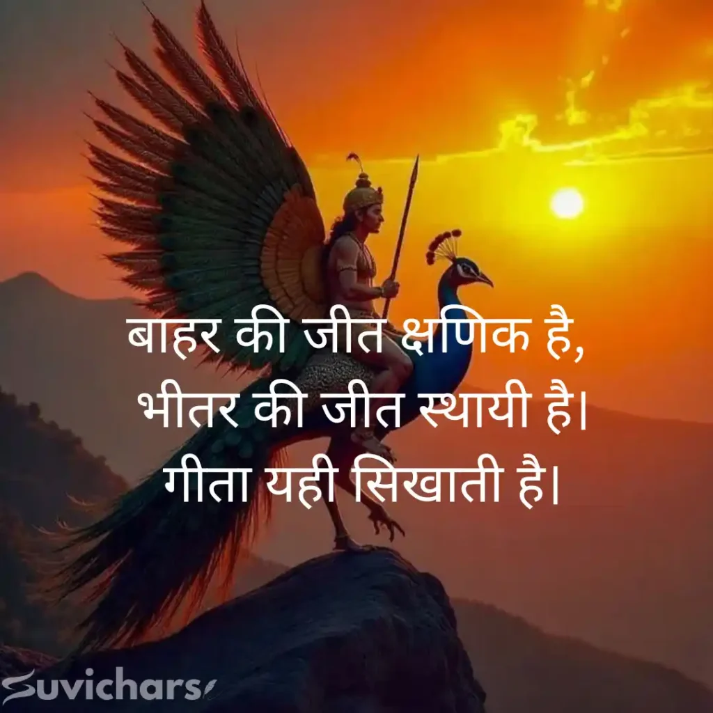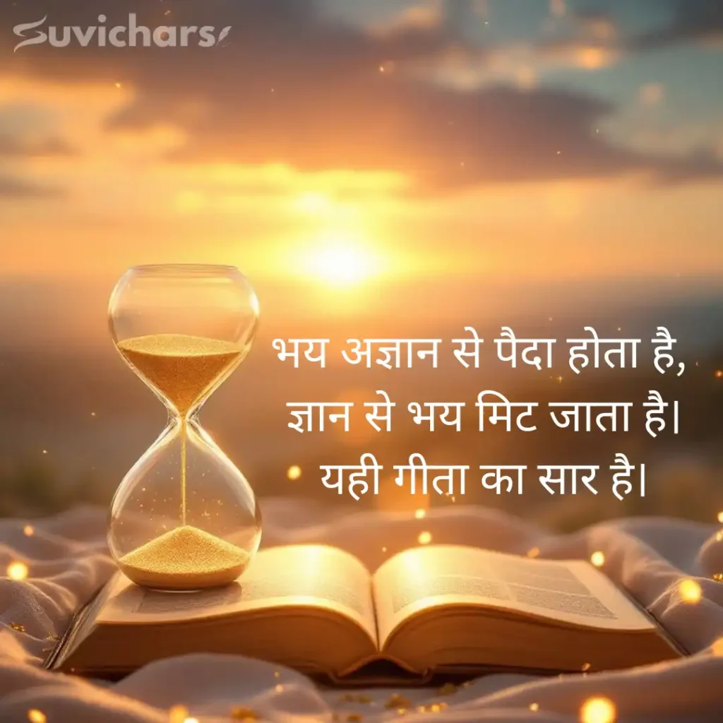 ये सुविचार छोटे हैं, लेकिन उनका प्रभाव गहरा है, कभी कर्म पर विश्वास सिखाते हैं, कभी फल की चिंता छोड़ने का संदेश देते हैं और कभी आत्मबल को मजबूत करते हैं। रोज़ाना इन Suvichar Geeta Gyan को पढ़कर आप न सिर्फ सकारात्मक सोच विकसित कर सकते हैं, बल्कि अपने जीवन के हर निर्णय को और बेहतर बना सकते हैं।